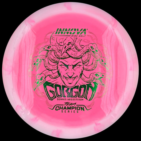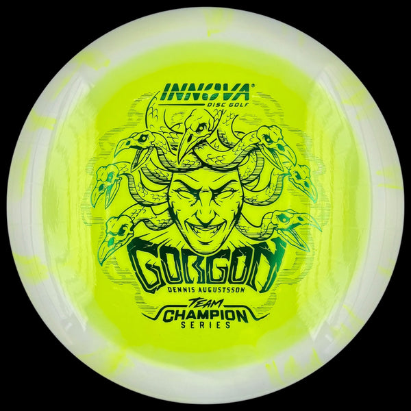 The [10|6|-2|1] Gorgon has a comfortable [10]-speed rim, making it controllable for almost any arm strength. Its maxed-out [6] glide is at the top of the charts, providing longer flights with less effort. Due to this surprisingly high glide, Dennis can fly his Gorgon as far as his faster drivers, but its smaller wing makes it even easier to manipulate at slower speeds.